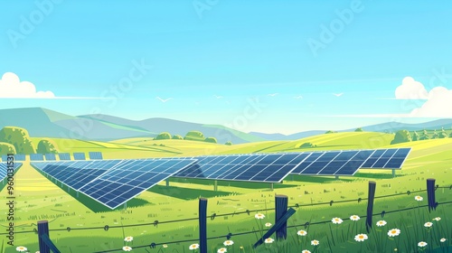 View of a solar farm harnessing sunlight flat design front view renewable energy theme animation Tetradic color scheme
