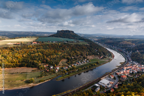 View of a village in the countryside in autumn near Saxon Switzerland Mountains. Valley of river Elbe. Dresden. Germany.