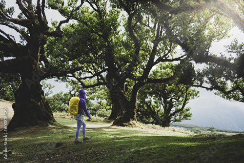 View of a woman walking under laurel trees on a sunny hill. Fanal Forest, Madeira Island, Portugal, Europe.