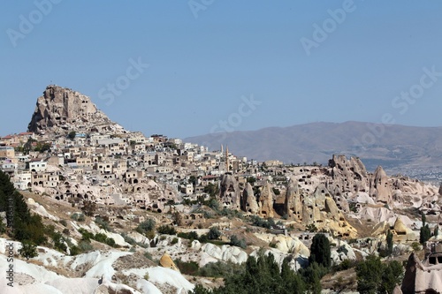 View of ancient Nevsehir cave town and a castle of Uchisar dug from a mountains in Cappadocia, Central Anatolia,Turkey