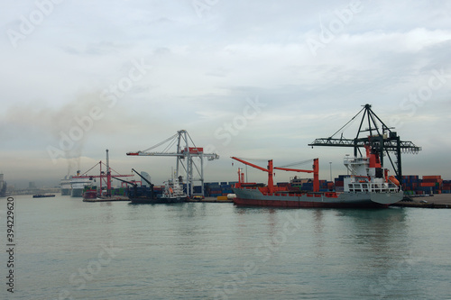 view of Barcelona port with harbour cranes and ruise ship. Barcelona, Spain