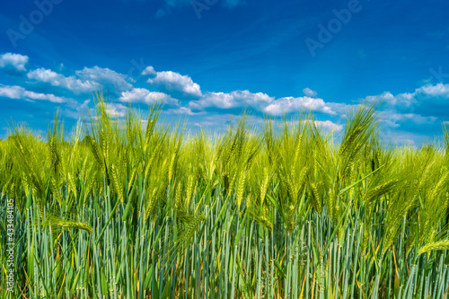 View of beautiful farm landscape of green wheat field in late Spring, beginning of Summer in Europe, blue sky with clouds