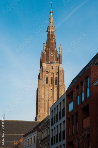 View of Church of Our Lady from the streets in Bruges, Belgium.