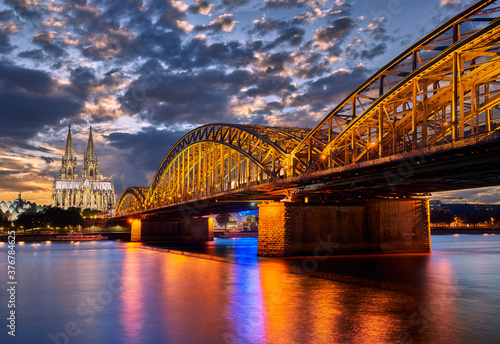 city, cathedral, church, building, exterior, sunset, bridge, arch, river, water, cloud, sky, illuminated, architecture, connection, travel, outdoors, nobody, no people, cologne, german, europa