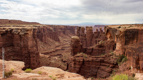 View of dramatic canyons with towering rock formations and cloudy sky in the late afternoon light