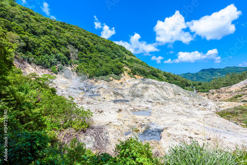 View of Drive-In Volcano Sulphur Springs on the Caribbean island of St. Lucia. La Soufriere Volcano is the only drive-in volcano in the world.