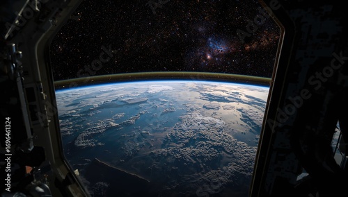 View of Earth and the Milky Way from a spacecraft's viewport aboard a space station. Image elements supplied by a space agency.