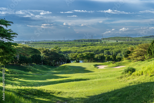 View of Golf Course with fairway, Golf course with a rich green turf beautiful scenery, Green grass and woods on a golf field