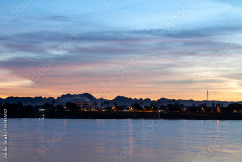 View of Khammouane Province, Laos, a small town on the banks of the Mekong River with many mountains in the background, early in the morning.