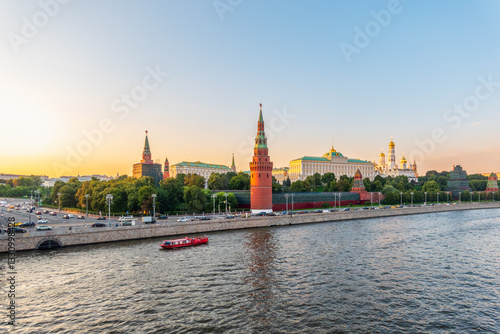 View of Kremlin with Vodovzvodnaya tower, Grand Kremlin Palace from repaired Bolshoy Kamenny Bridge in Moscow city on sunny summer day. Cruise ship sails on the Moscow river