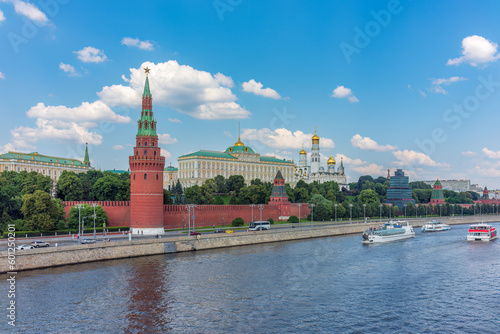 View of Kremlin with Vodovzvodnaya tower, Grand Kremlin Palace from repaired Bolshoy Kamenny Bridge in Moscow city on sunny summer day. Cruise ship sails on the Moscow river
