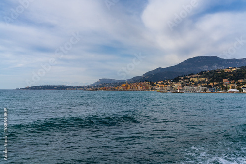 view of the colorful old city center of Menton with the blue Mediterranenan Sea in the foreground