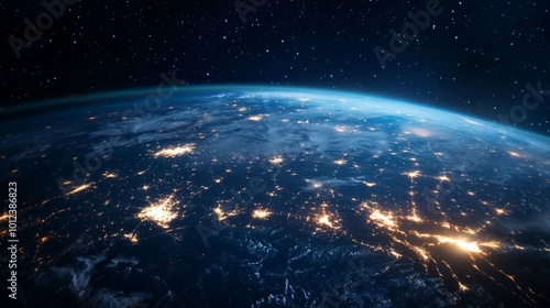 View of the Earth from space at night, with light trails linking continents, representing digital global networks generative ai