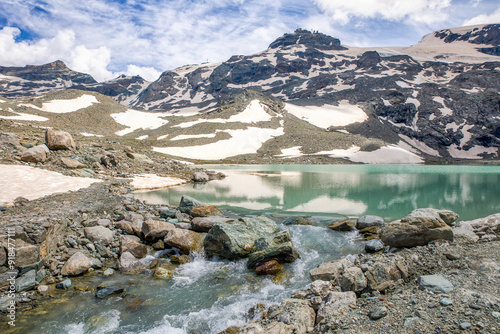 View of the green lake cime bianche and a small creek in the summer sun under a blue sky with a few beautiful clouds
