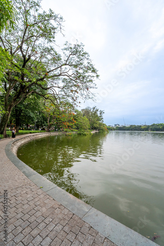 view of The Huc Red Bridge and Ngoc Son temple in the center of Hoan Kiem Lake, Ha Noi, Vietnam.