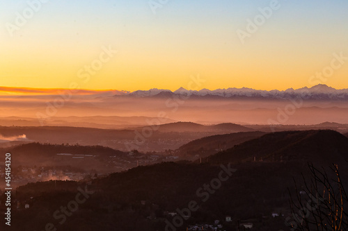 View of the misty and fog surrounding the mountains of the Italian Alps at winter sunset. Layers of mountains. Nature tourism.