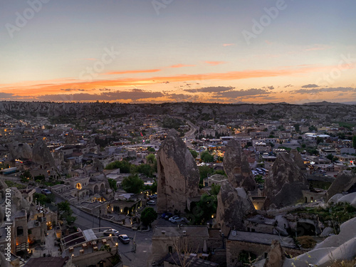 View of the night city of Goreme, Cappadocia, Turkey. Beautiful sunset from the observation deck