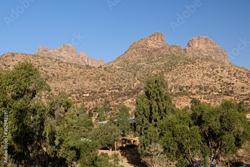 View of the rocky mountains above Yeha city. Tigray region. Ethiopia. Africa.