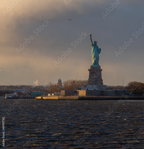 View of the Statue of Liberty during the day with boat docked on the island and Plane flying overhead
