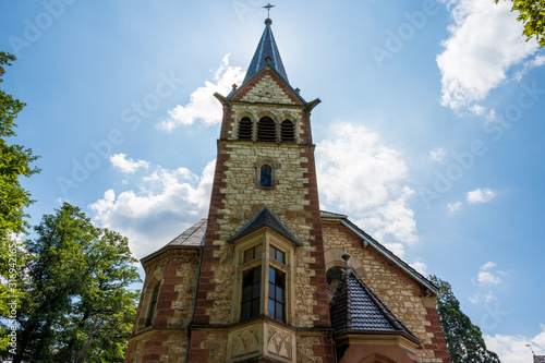 View of the tower of the Martin-Luther-Church in Staufen im Breisgau