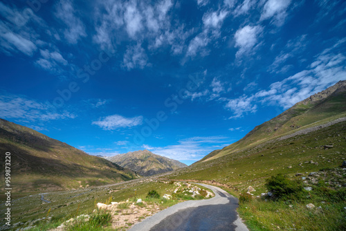 View of winding road through majestic mountains under a serene sky, Sarfaranga Cold Deserts, Skardu, Pakistan.