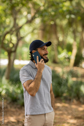 View of young man using a smartphone at day time with a green park in the background. High quality photo