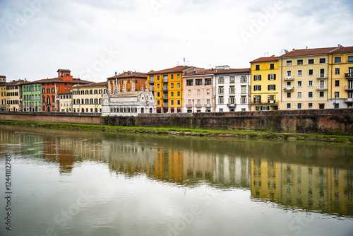 View on Arno river and colorful building, reflection in water, Pisa, Italy