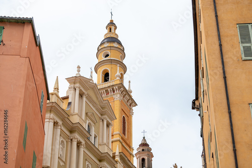 View on French Riviera, colorful Menton old city and marina on blue Mediterranean Sea near French-Italian border, travel destination, panoramic view from above