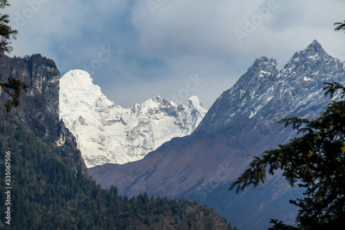 View on Himalayas, Annapurna Circuit Trek, Nepal. The view is disturbed by dense tree crowns in the front. High snow caped mountains peaks catching the first beams of sunlight. Serenity and calmness