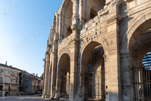 View on streets and Roman Arena in ancient french town Arles, touristic destination with Roman ruines, Bouches-du-Rhone