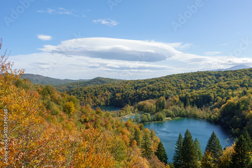 View over an autumn colored forest with a blue mountain lake against blue sky with fair weather clouds