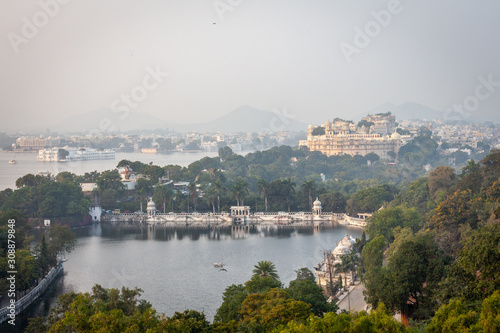 View over the Pichola lake and the city palace of Udaipur from the ropeway, Rajasthan, India