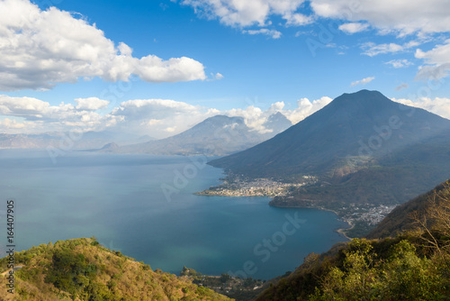 Viewpoint at lake Atitlan with the three volcanos San Pedro, Atitlan and Toliman - you can see the small villages San Pedro and San Juan at the lake in the highlands of Guatemala