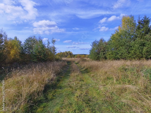 sky, landscape, nature, grass, tree, forest, meadow, field, road, cloud, blue, autumn, green, summer, rural, tree, cloud, path, fall, countryside, country, view, hill, sunny