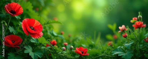 Vines twine around large red poppies amidst lush green foliage, flora, green