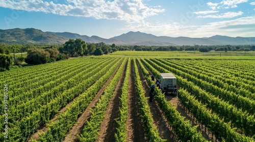 vinery, grape, grape, wine, winery, vinification, vine, vine, farm, farmer, agriculture, harvest, harvesting, rural, landscape, nature, countryside, green, field, row, mountain, mountain, sky, cloud, blue, sunny, day, summer, aerial, view, truck, vehicle, men at work, men at work, people, person, working, labor, farming, farmland, industry, vine-growing