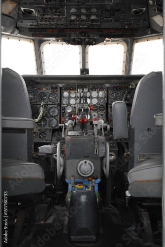 aeroplane, cockpit, aircraft, instrument, panel, control, yoke, seat, aviation, flight, vintage, retro, old, aged, weathered, gauge, dial, machinery, technology, transport, travel, overhead, perspective, view, interior, detail, design, mechanical, engineering, aerospace, pilot, captain, air, sky, cloud, journey, adventure, exploration, freedom, speed, altitude, navigation, system, buttons, switch, lever, dashboard, grey, metal