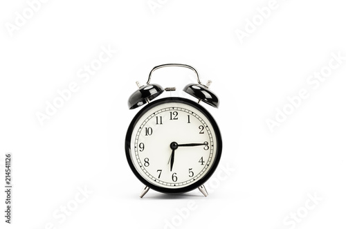 clock, alarm, isolated, white, background, retro, vintage, morning, black, time, wake up, antique, old, classic, timer, watch, circle, 6, late, bell, alert, rush, hours, minute, countdown, waking, up, front, view, closeup, shadow, analog