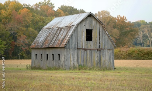 vintage barn in a field. gray barn weathered wood. gentle breeze blowing on the field. during autumn