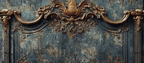 Vintage Baroque style wall with weathered blue and gold textures featuring ornate designs and intricate details ideal for historical elegant backdrops