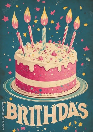 Vintage Birthday Cake with Colorful Candles and Sprinkles Design