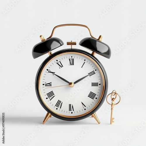 Vintage black and gold alarm clock with key on a clean white background