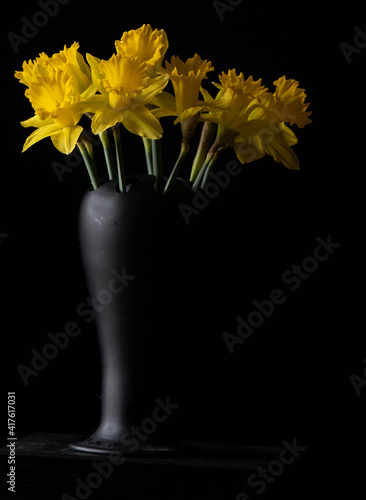 Vintage black satin vase and yellow daffodils