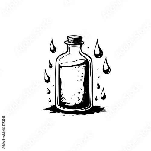 bottle, liquid, drop, vintage, health, natural, spa, illustration, treatment, wellness, medicine, aromatherapy, cosmetic, drawing, alternative, healing, herbal, organic, potion, remedy, science, droplet, container, retro, monochrome, isolated, element, beauty, care, vector, product, symbol, design, graphic, simple, minimal, outline, black, white, art, image