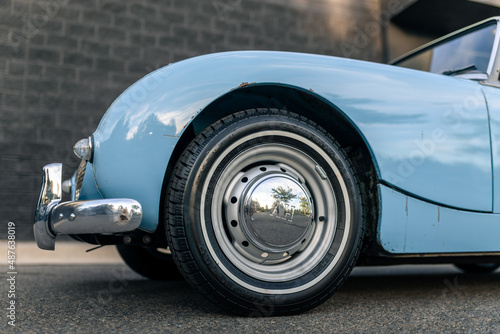 car, auto, automobile, vehicle, classic, vintage, luxury, transport, transportation, fast, speed, sport, sport, design, cabrio, drive, race, wheel, silver, blue, light blue, british, detail, shiny, clean, steer, steering wheel, side, empty, nobody, journey, escape, travel, tire, machine, hubcap, door, windscreen, mirror, hardtop, coupe, retro, brick, hood, bonnet
