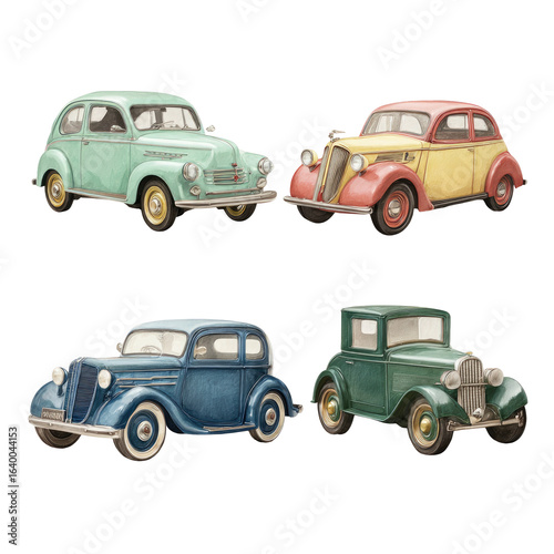 Vintage cars, four classic vehicles in pastel colors, fronts only