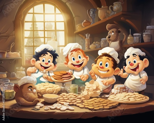 Vintage cartoon characters enjoying homemade cookies, Retro, Muted tones, Digital art, Classic and nostalgicwhite background,