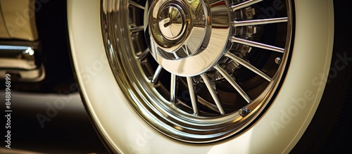 Vintage chrome spoke wheel featuring white faced rubber and center nut with ample copy space image