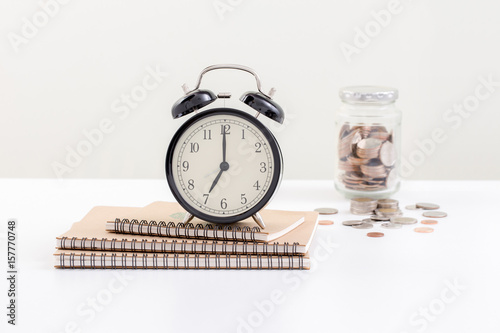 money, business, concept, background, clock, vintage, financial, notebook, finance, banking, coin, white, table, work, office, success, time, investment, economy, save, design, calculating machine, hourglass, blank, wealth, bank, payment, tax, stack, growth