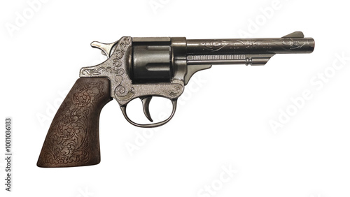Vintage cowboy revolver with patterned grip is isolated on a white background. Firearm vintage gun.